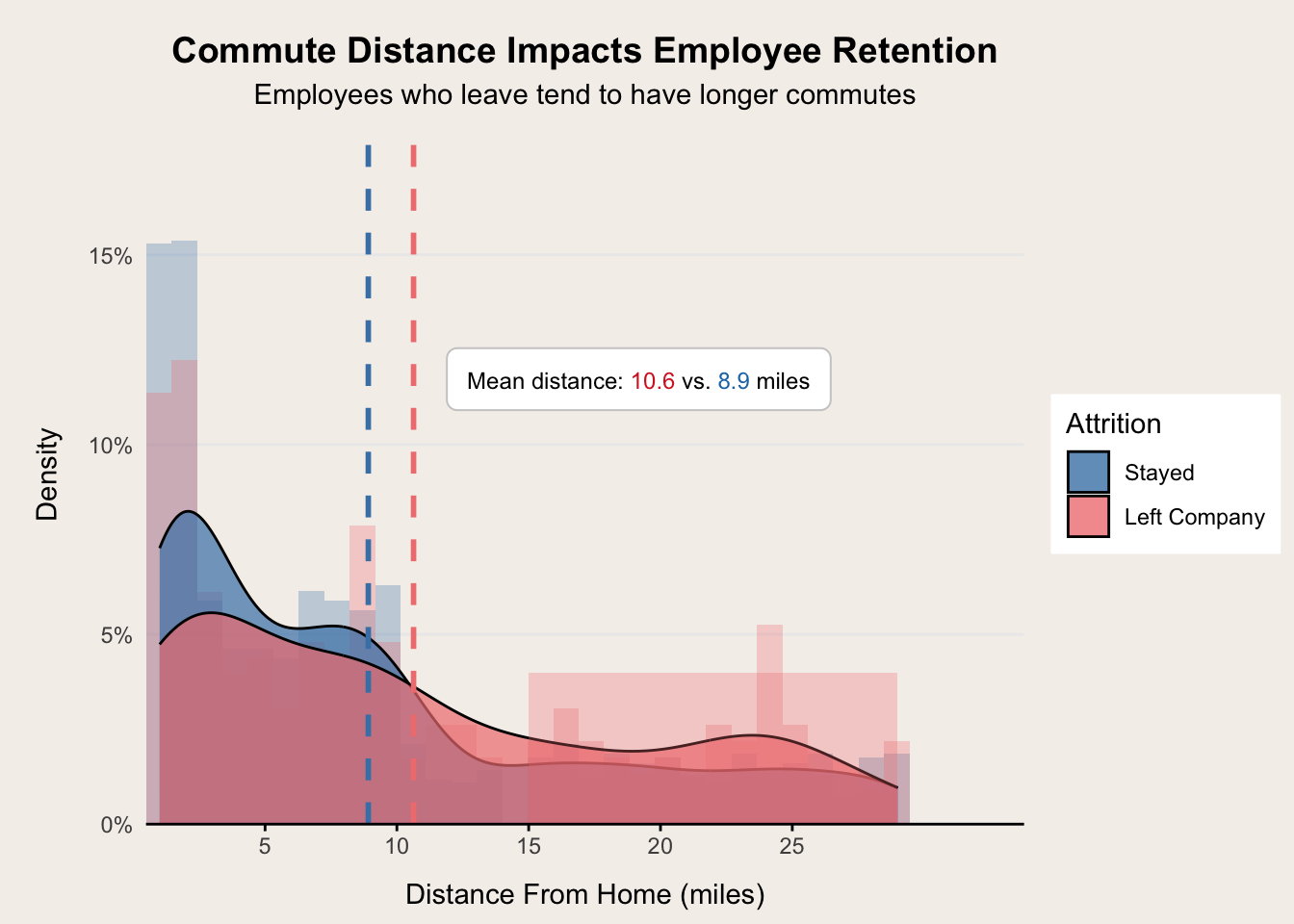 Employees who left were often living farther from the office. Although I can’t be sure commute distance alone causes turnover, it likely adds stress and impacts work-life balance, making employees more willing to leave.