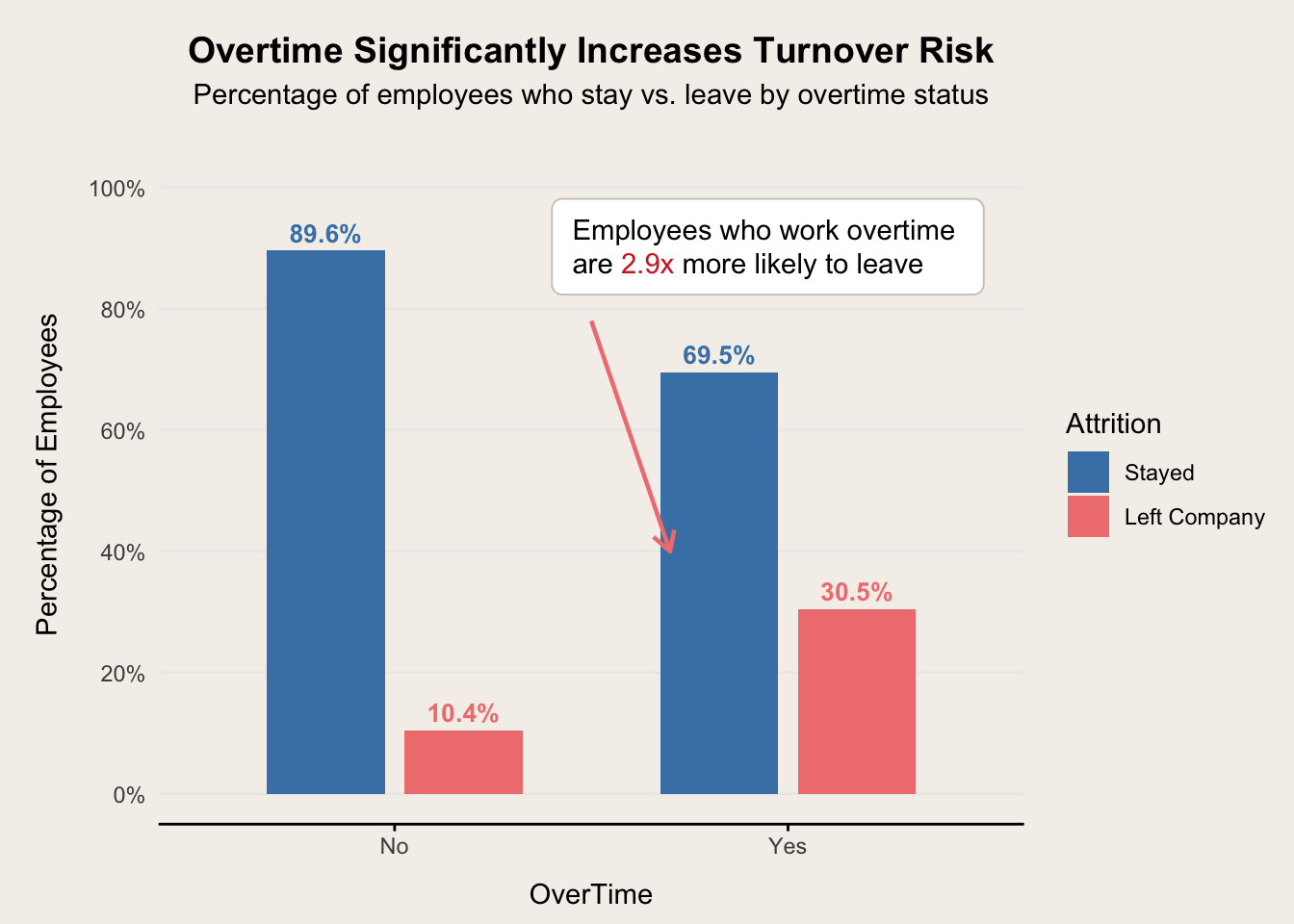 Working overtime clearly makes employees much more likely to leave. Regular overtime hours cause employees to burn out, feel stressed, and become unhappy at work.