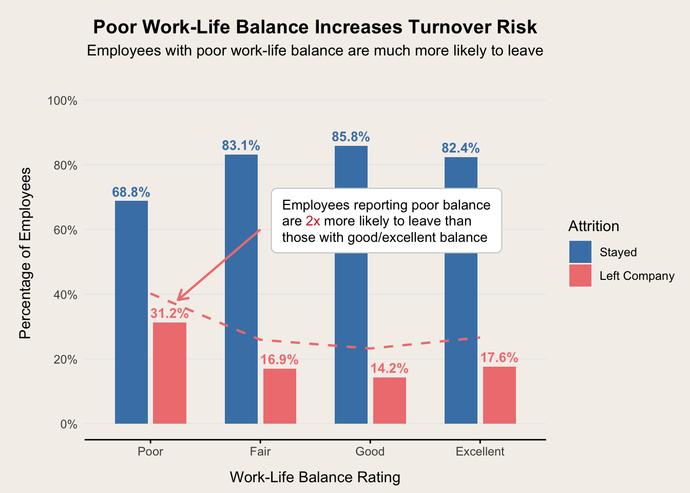 Employees who rated their own work-life balance lowest (rating “1”) were much more likely to leave the company. Better work-life balance ratings (2 and above) were linked to lower attrition.