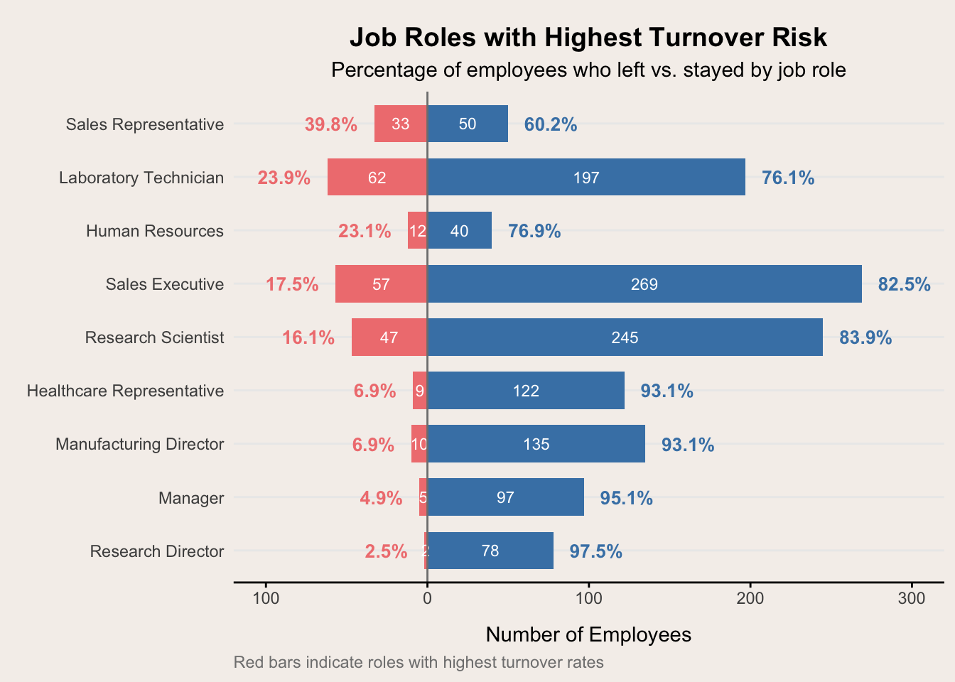 Certain jobs have more turnover than others. Laboratory Technicians saw the highest total number of people leaving. Sales Representatives had the highest percent turnover rate (66%). Research Directors had the lowest turnover rate.