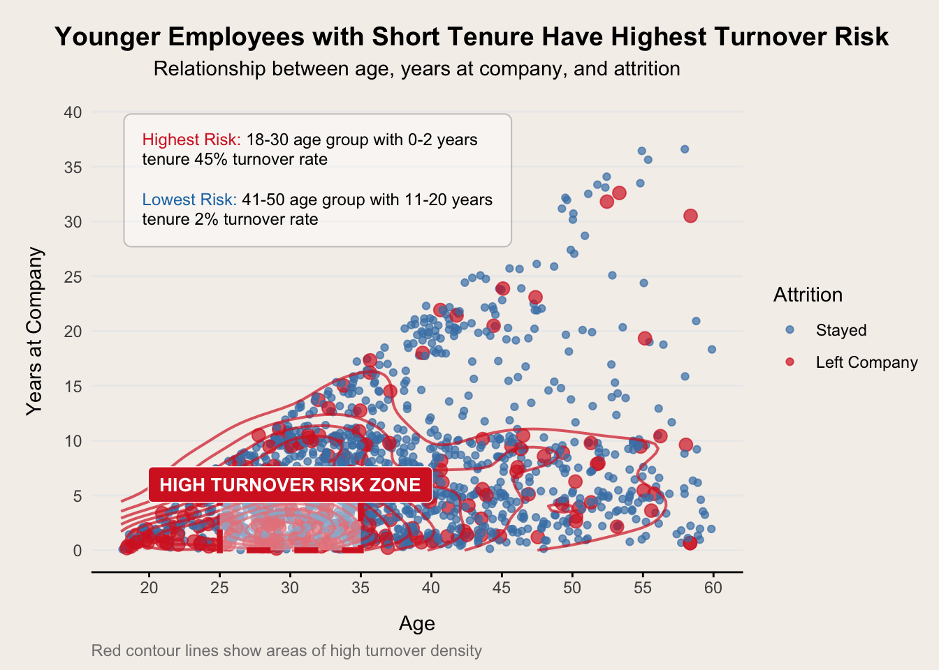 Younger employees with fewer years at the company are more likely to leave, while older, long-term employees usually stay. I can see these patterns clearly from the concentration of people marked in red in the lower-left corner of the plot above.