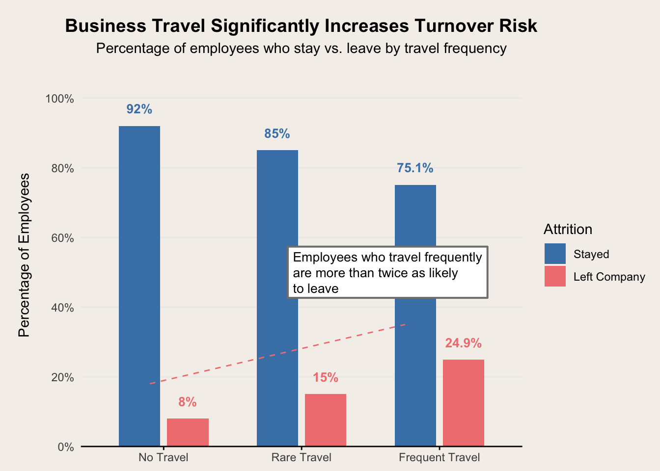 Employees who travel frequently for business purposes are clearly more likely to leave the company. Frequent travel likely causes higher stress and lower job satisfaction.
